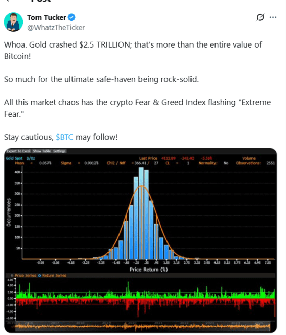 금융분석가인 톰 터커는 23일(현지시각) 소셜미디어(SNS) X(옛 트위터)에 “세계에서 가장 오래된 가치 저장수단인 금의 시총이 2.5조달러 감소했다”며 “이는 비트코인 전체 시총을 웃도는 규모”라고 밝혔다.