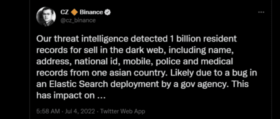 창펑자오 “한 아시아 국가 10억명 정보 다크웹에서 판매 감지”